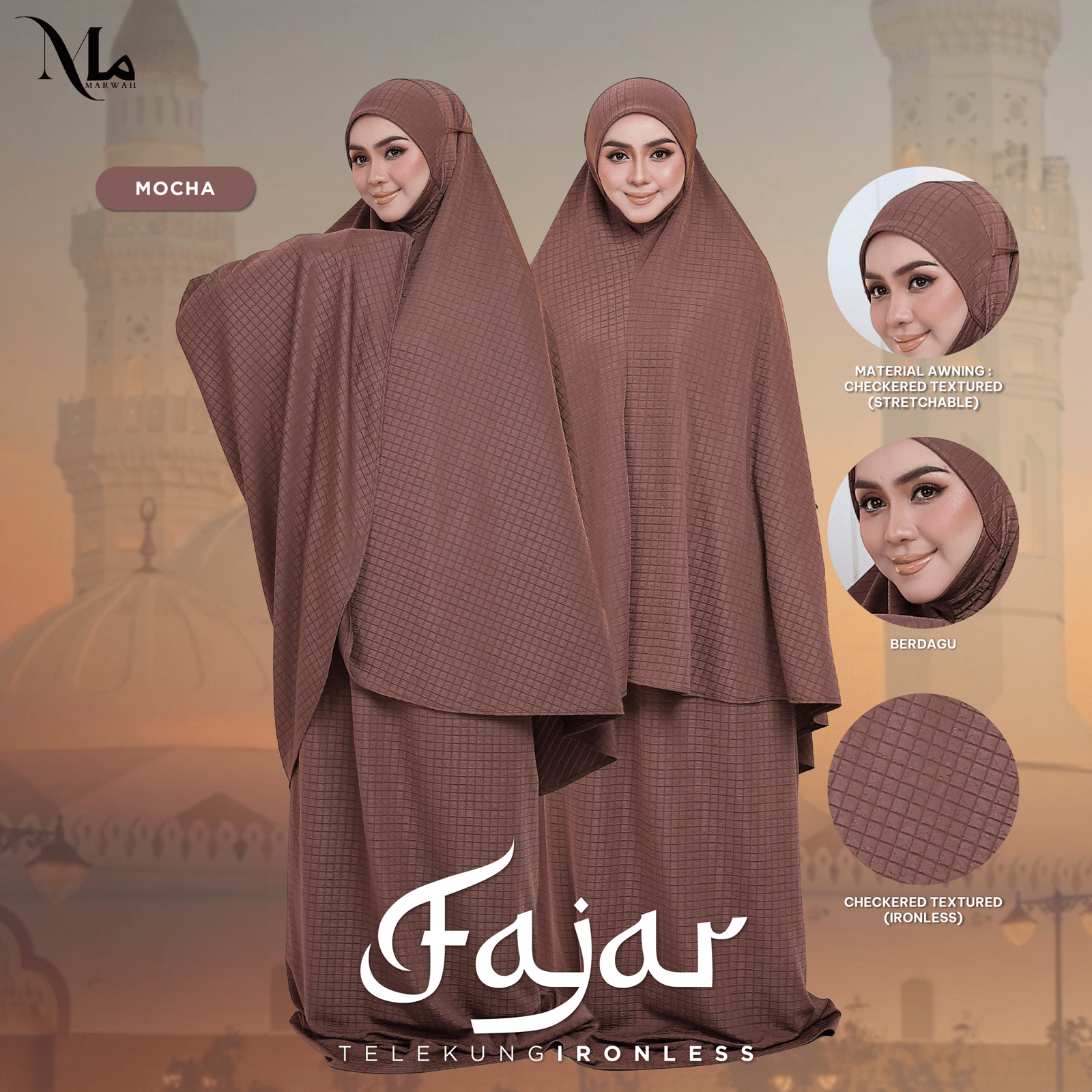 Telekung Fajar dibuat daripada bahan yang berkilat, memberikan tampilan yang menarik. Bahan ini juga mempunyai corak kotak-kotak yang unik, menambah gaya kepada telekung anda. la memberikan penampilan yang istimewa dan menarik.