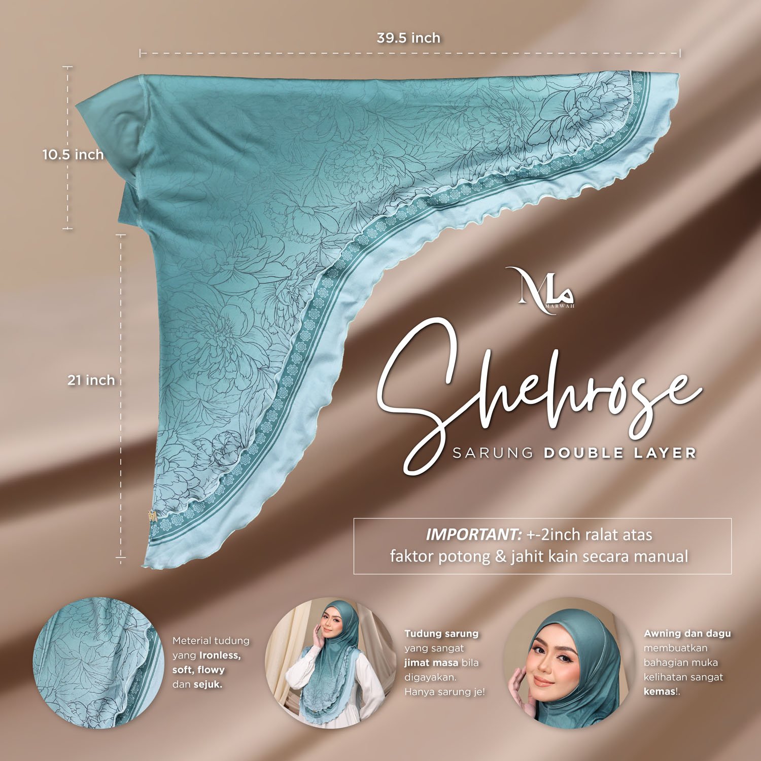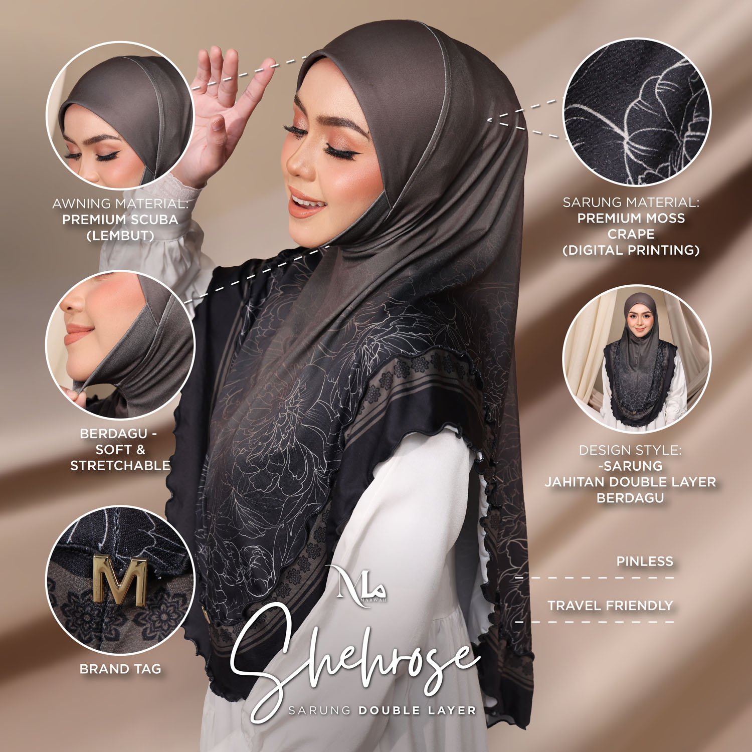 Shehrose SARUNG DOU LAYER menawarkan kain premium Moss Crape dengan cetakan digital. Jilbab ini mempunyai dua lapisan yang sesuai untuk pelbagai kegunaan.